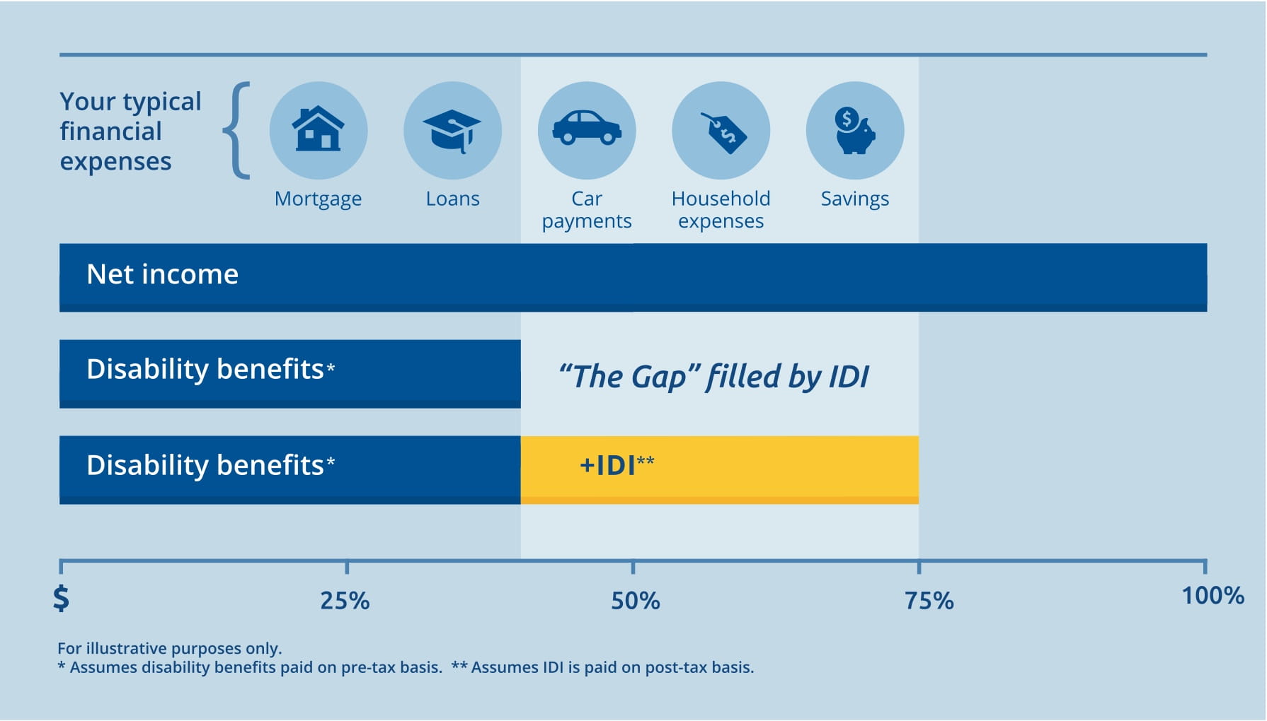 The example below shows how Individual Disability Insurance can help close the gap left by other Disability Insurance. As a higher earner, you may have earnings that aren’t covered by regular Disability Insurance, requiring you to dip into savings or rely on loved ones. Individual Disability Insurance can provide an additional monthly benefit to help you cover your bills and day-to-day expenses without causing long-term damage to your financial health.